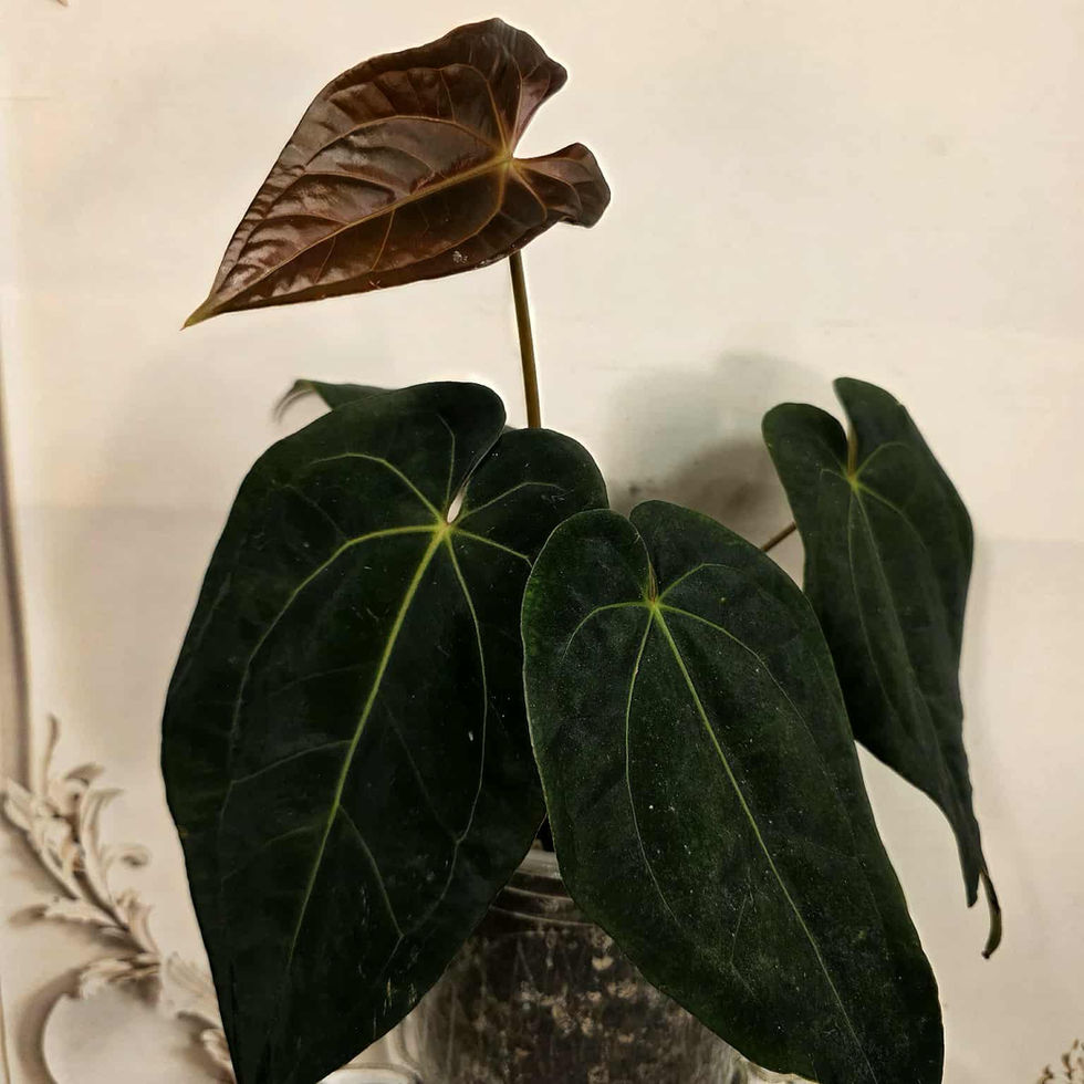 This selfed hybrid brings the moody depth of Papillilaminum and the iconic heart shape of Ace of Spades together in a richly textured velvet finish. Each leaf shows dramatic veining, dark coloration, and a clean upright structure, while new growth flushes warm and glossy before settling into deep velvet. Rooted, established, and thriving in our greenhouse environment, Grown in Sammie-Pie’s Signature Tropical Soil Mix.