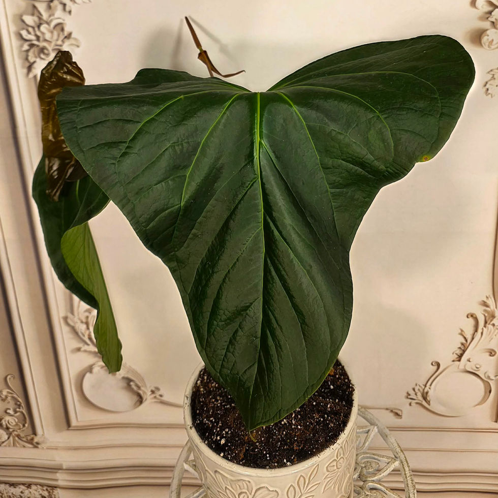 This Anthurium Dark Crystallinum x Pinkleyi from Silver Krome Gardens (Original SKG Tag included) showcases the dramatic depth and velvety saturation collectors prize, with broad sculpted lobes, bright crystalline veining, and a new leaf emerging in a rich bronze wash that promises even greater presence as it matures. The Pinkleyi influence brings exaggerated form and lift, while the crystallinum parentage delivers that unmistakable bold contrast, making this one of the standout hybrids in its class. It is rooted, established, and thriving in our Signature Tropical Soil blend.