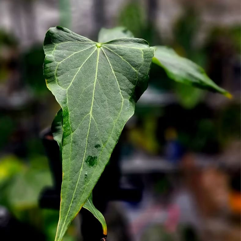This Anthurium ‘Delta Force’ displays a distinctive dark, narrow triangular leaf form across four developed leaves with elongated proportions and pronounced venation radiating from the central midrib, creating a refined blade profile highlighted by a sharp drip tip and balanced canopy structure. The foliage presents deep green coloration and smooth matte texture that emphasizes the striking geometry of this sought-after Delta Force phenotype, offering a bold architectural presence