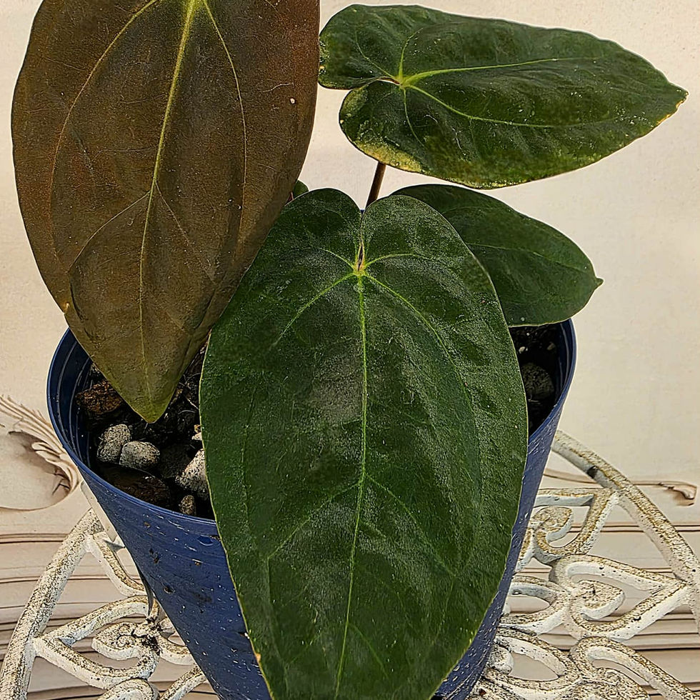 This hybrid brings together the deep, velvety richness of Papillilaminum ‘Dark’ with the elongated, structured elegance of Antolakii ‘Chubbs’. The foliage carries a warm chocolate flush as new leaves harden, settling into deep green with soft velvet texture and subtle ghosted veining. Each leaf narrows into a clean tapered tip, giving this plant a refined, architectural presence. Rooted, established, and thriving in our greenhouse environment. Grown in Sammie-Pie’s Signature Tropical Soil Mix.