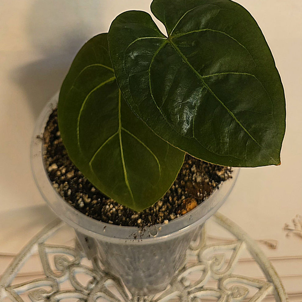 This juvenile Papillilaminum × Hulk shows the early structure collectors look for: dark forming foliage, thick leathery texture from Hulk lineage, and the classic Papi heart-shape that develops into broader velvety leaves as it matures. A compact, well-established young plant with strong growth potential.Grown in Sammie-Pie’s Signature Tropical Soil Mixture.