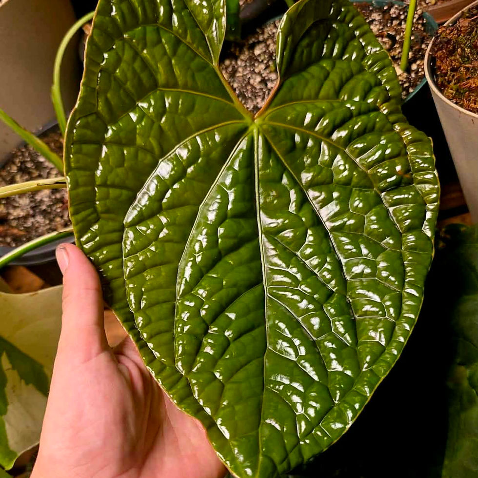 This Pure Lux brings an extraordinary depth of color and a glassy, high-gloss finish across broad quilted leaves that command attention from any angle. Thick texture, dramatic veining, and a deeply architectural presence make this plant a standout centerpiece. Rooted, established, and thriving in our greenhouse environment. Grown in Sammie-Pie’s Signature Tropical Soil Mix.