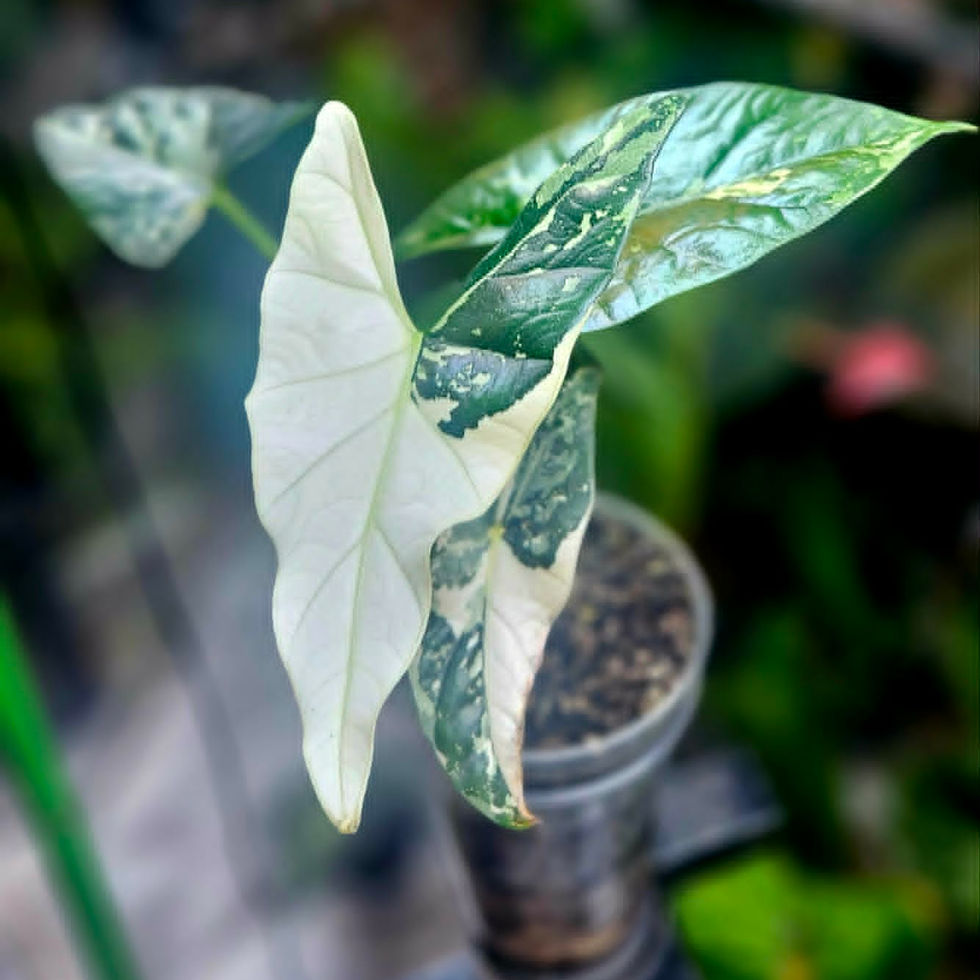 Alocasia Simpo Albo presenting a balanced mix of sectoral and marbled variegation across multiple leaves, including a dominant white sector leaf paired with darker green foliage carrying scattered variegation throughout, supported by a clean arrow-shaped structure and upright growth, with a solid base and spacing indicative of corming readiness, giving the plant a strong visual presence with consistent pattern expression and well-proportioned form