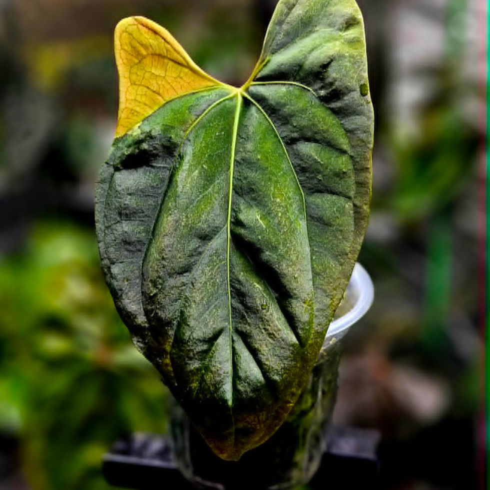A Wu 8 × Wu 9 papillilaminum showing a clean, narrow leaf with a matte surface and subtle texture, interrupted by a defined yellow sector that cuts across the upper portion of the blade and creates a clear contrast against the deep green field. The transition between tones carries slight mottling, softening the edge while maintaining a distinct separation of color, and the overall shape remains symmetrical and balanced, allowing the variegated section to stand out without overwhelming the structure. The presentation is simple and focused—one leaf, one clear point of interest, and a composition that reads immediately from form and contrast